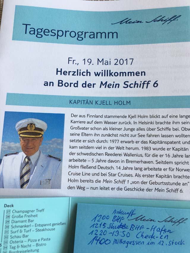4-tägige Mini-Kreuzfahrt auf der Ostsee mit der MeinSchiff 6 ab/bis Kiel (noch vor der Taufe in Hamburg). Flüge mit SWISS nach Hamburg und zurück und anschliessender Fahrt mit dem KielBus zum Bahnhof und Ablegehafen in Kiel. Unterbringung in einer SPA Balkonkabine. Tag auf See und Halt in den Anlegehäfen Danzig (Polen) und Bornholm (Schweden) mit Ausflügen auf eigene Faust. Bereist von Susan und Marc Sulzberger