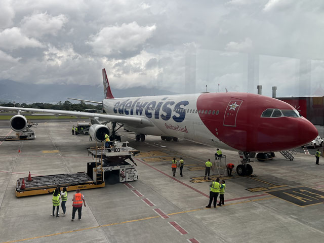 Direktflug mit Edelweiss in Business-Klasse ab Zürich nach San Jose und ab Liberia nach Zürich. Hinflug noch mit der A340-300 und Rückflug bereits mit der A350-900 in der grossen Business-Klasse, wieder in der Front der Maschine 2 - 2 - 2 bestuhlt.