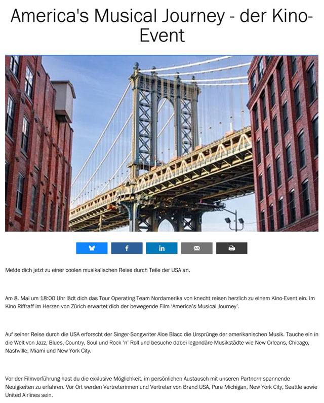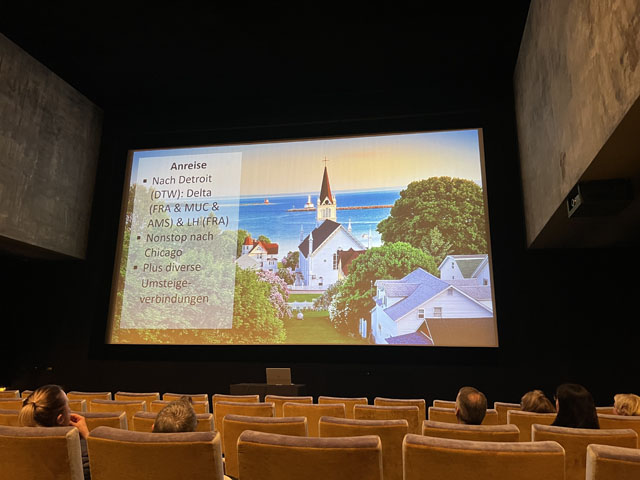 Kurzweiliger Informationsabend im Kino Riff Raff in Zürich, von Knecht Reisen organisiert. Vorstellung der Dachorganisation "Brand USA" sowie "Visit Seattle", "Pure Michigan", "New York City" sowie "United Airlines. Anschliessende Vorführung des Kurzfilms "America's Musical Journey" und anschliessende Verköstigung mit Crispy Fried Chicken, Mini Burgers und Brownies (hervorragend).